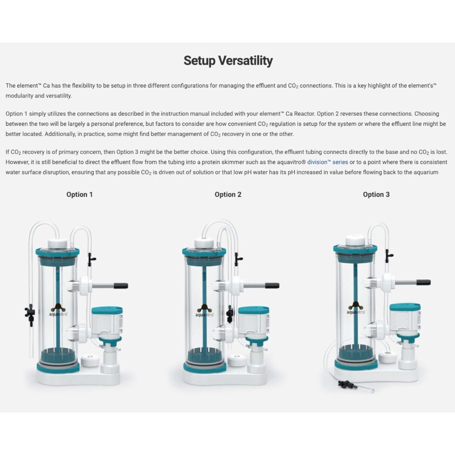 Option 1 simply utilizes the connections as described in the instruction manual included with your element™ Ca Reactor.
