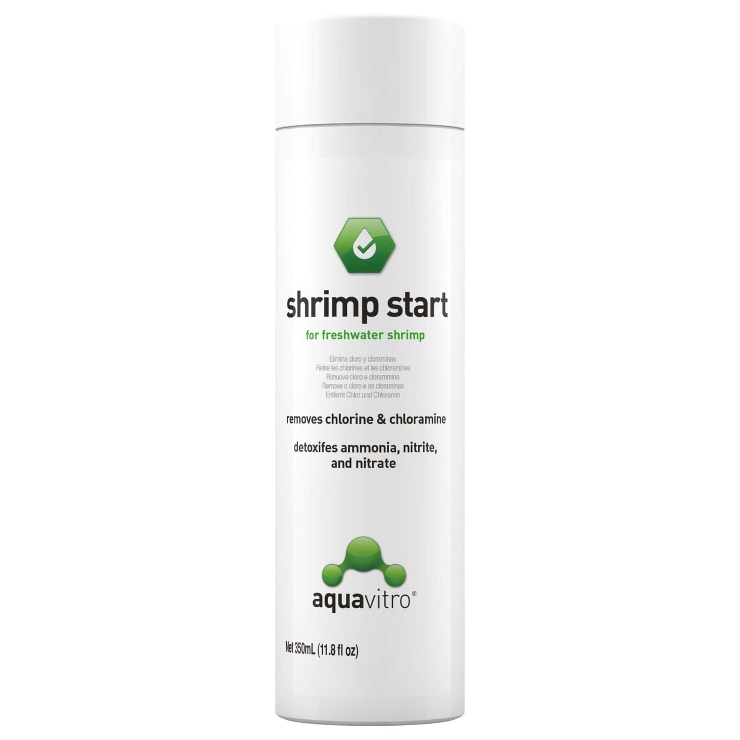 Aquavitro Shrimp Start is a complete conditioner for freshwater shrimp aquariums that removes chlorine, chloramines, ammonia, nitrite, nitrate, and detoxifies heavy metals found in tap water.