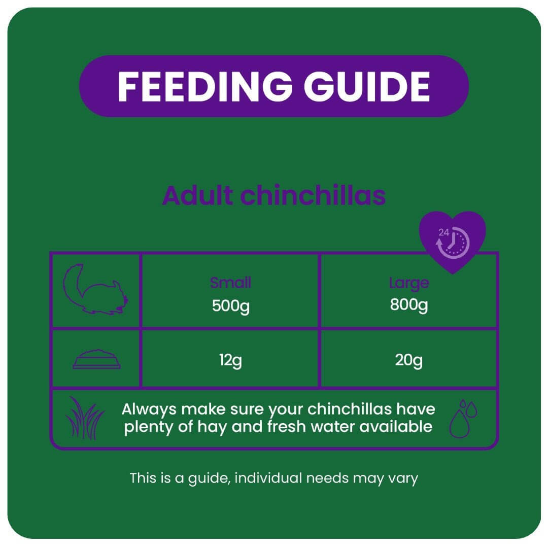 Remember that good-quality hay and/or grass should make up the majority of your chinchillas’ diet and should be available at all times. Chinchillas should also be fed a small amount of leafy greens each day. Please talk to your vet for further information. If you are currently feeding a muesli-style food to your chinchillas you should gradually transfer your pets onto a hay and nugget-based feeding plan over between 14 and 28 days, by gradually reducing the amount of muesli and increasing the proportion of nuggets until they have completely replaced the mix. Always ensure you are monitoring your chinchillas’ weight to ensure a healthy weight. Always ensure fresh clean water is available for your chinchillas.