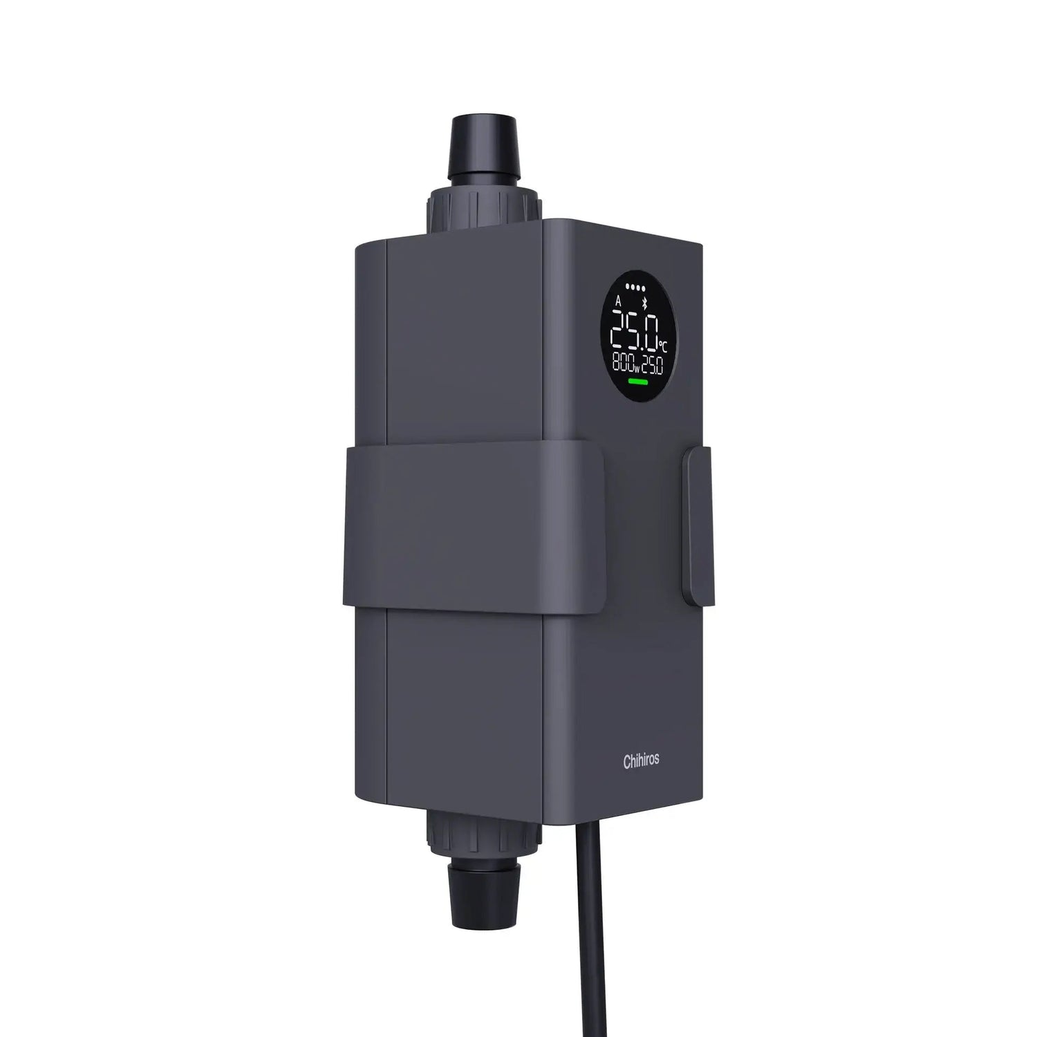 The Chihiros Heater Pro is an external heater designed for tanks measuring 150-180 cm, with a water volume of 450-650 L. You can adjust the temperature using the My Chihiros app, which allows settings from 10°C to 35°C. The heater connects inline with a 12/16 OR 16/22 mm fitting, depending on the model.