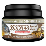 Dennerle Cookies Special Menu is a food designed for bottom-dwelling fish, shaped into wafers that sink quickly and contains aquatic animal components along with high-quality plant-based ingredients like moringa leaves and grape seed oil.