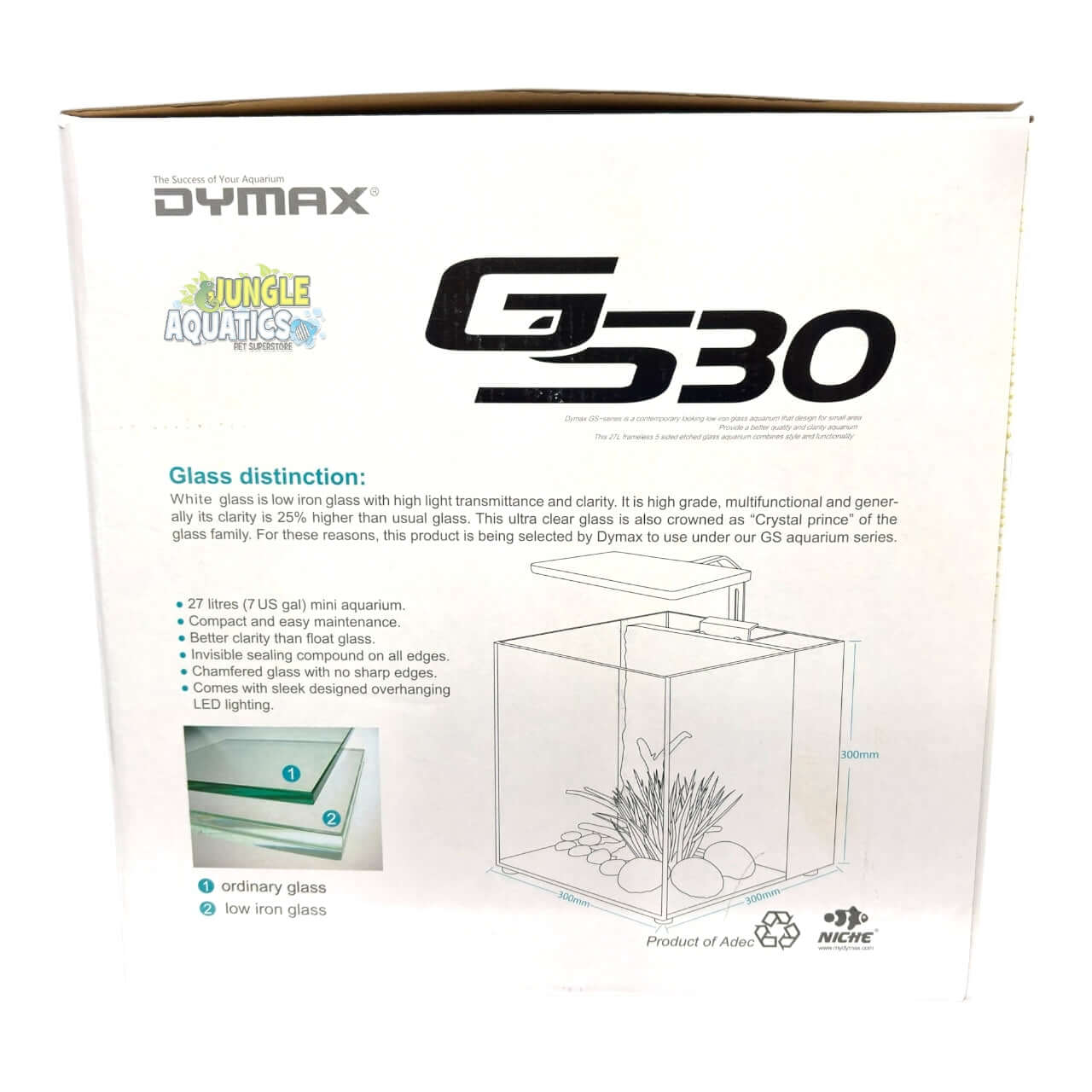 The Dymax GS30 is a premium 27-litre (7 US gallon) cube aquarium built with rimless ultra clear low iron glass with all sides chamfered for superior clarity and safety.