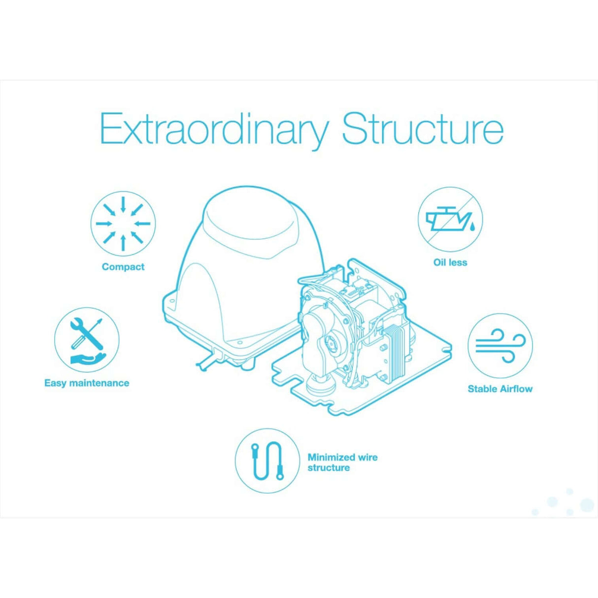 - Oilless – a floating rare earth magnet and two proprietary synthetic diaphragms are the only moving parts, which means no pistons, bearings, or other wear items.