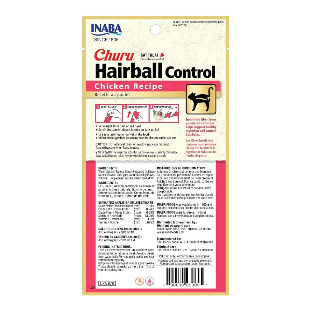 At Inaba, we understand that your cat is a cherished member of your family. That's why our Churu Lickable Cat Treats for Hairball Control are made with high-quality ingredients, including wild-caught tuna and farm-raised chicken. Since cats spend 30-50% of their waking hours grooming, we've developed a functional treat rich in insoluble vegetable fiber to support digestion and help reduce hairballs. These treats are low in calories and high in moisture (6 calories per 88% moisture), making them both tasty and nourishing. Free from grains, preservatives, artificial colors, and carrageenan, they are enriched with Vitamin E to boost your cat's immune system and Taurine for overall health. You can feed these treats by hand to encourage interaction, use them as a topper on dry kibble or wet food, or even to mask medication tastes—whichever you prefer. Available in two flavors, these treats are suitable for cats of all ages, from kittens to seniors. Inaba makes snack time enjoyable for your feline friend.