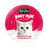 Kit Cat Boneless Chicken Shreds & Smoked Fish Flakes with Goat's Milk is a grain-free complimentary diet for cats of all life stages, designed for those with sensitive stomachs and digestive issues.