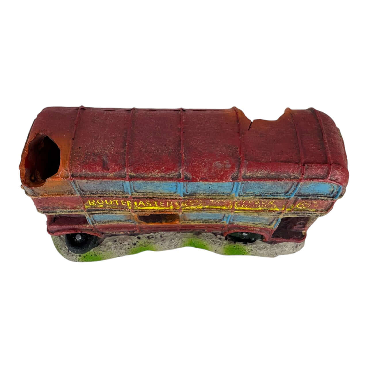 Crafted with intricate detail, the bus features faded red, brown, blue, and yellow hues that evoke a sense of age and mystery. The distressed paint finish, broken sections, and subtle signs of decay create an authentic shipwreck effect, adding depth and character to your aquatic environment. The classic "ROUTEMASTERS" name, "LONDON TRANSPORT" signage, and the recognizable London Underground symbol are all faithfully represented, making it a delightful nod to London’s transport heritage.