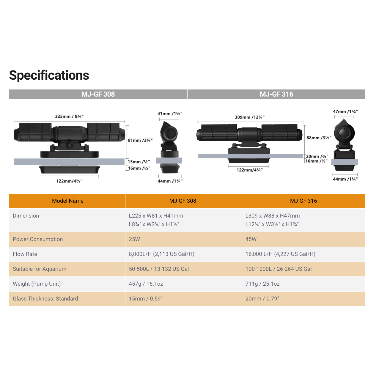 The latest innovation in the MJ-GF Series pumps features new clip-on flow director cages, designed to significantly improve the flow rate over previous generations. These cages allow for precise control over the direction of water flow, enabling you to target specific areas of your aquarium. These adjustable cages provide the flexibility to optimize water movement for the unique needs of your tank, aquascape, and types of corals you're keeping.