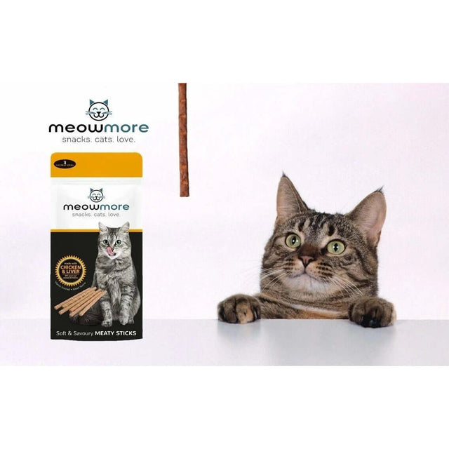 Meow More Cat Treat Sticks 3-Pack is used to provide cats and kittens with a soft and savoury treat made with real meat, enriched with vitamins and minerals for overall health.