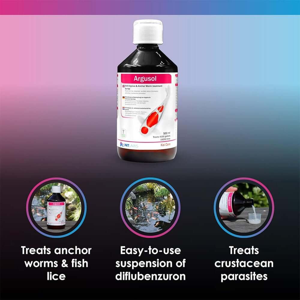 NT Labs Koi Care Argusol is an effective treatment for fish lice (Argulus), Anchor Worm (Lernaea) and other crustacean parasites in Koi ponds. Argusol is an easy to use suspension of Diflubenzuron which is a powerful crsuteacean medication suitable for koi only.