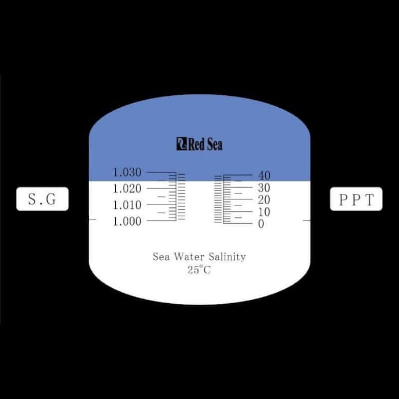 Therefore, Red Sea’s Seawater Refractometer calibrated at 25°C/77 0F directly reads the absolute salinity of seawater with no need for temperature compensation factor)