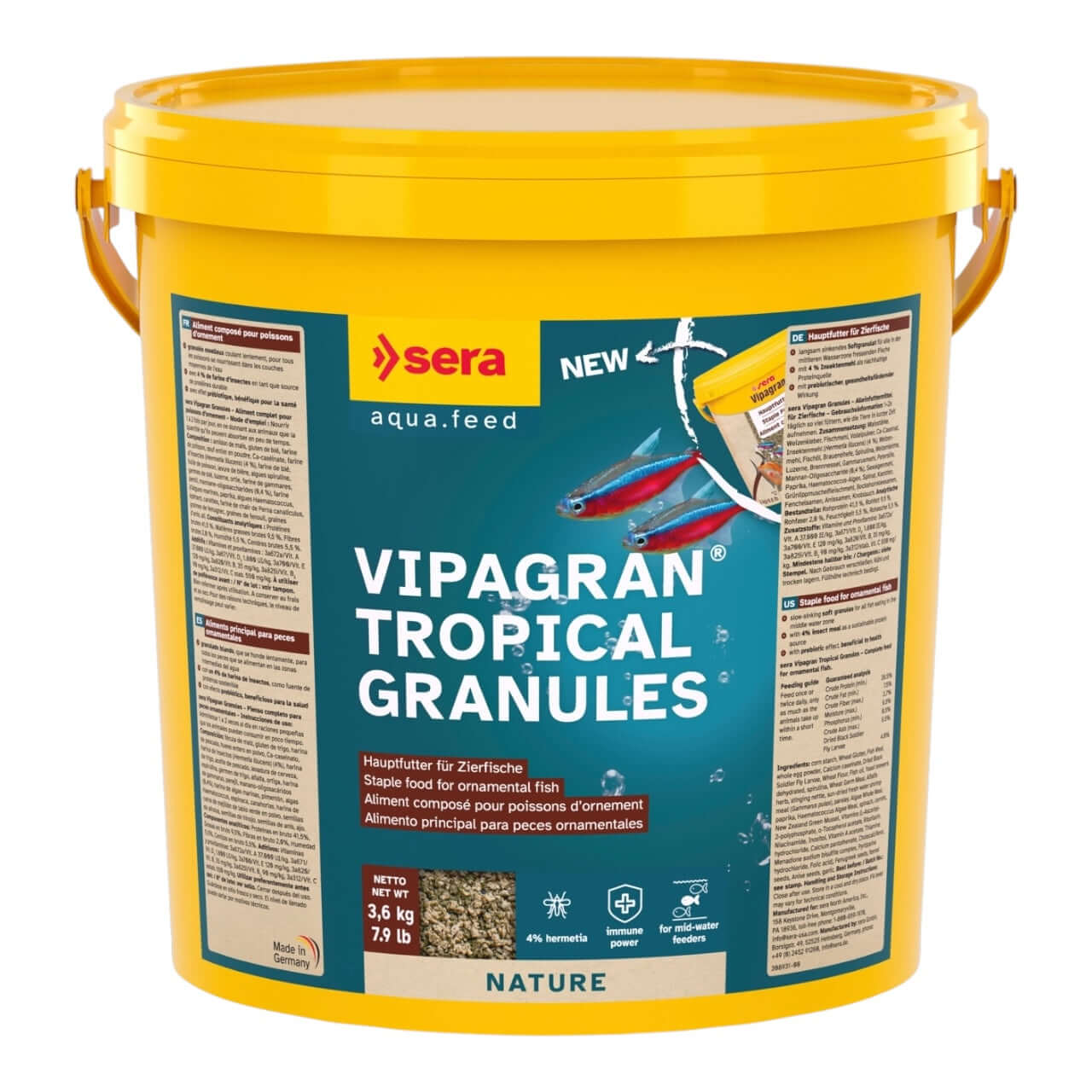 Sera Vipagran Granules is a staple food designed for ornamental fish that feed in the middle water zone, providing a balanced diet with high-quality ingredients and prebiotics to support healthy growth and development.