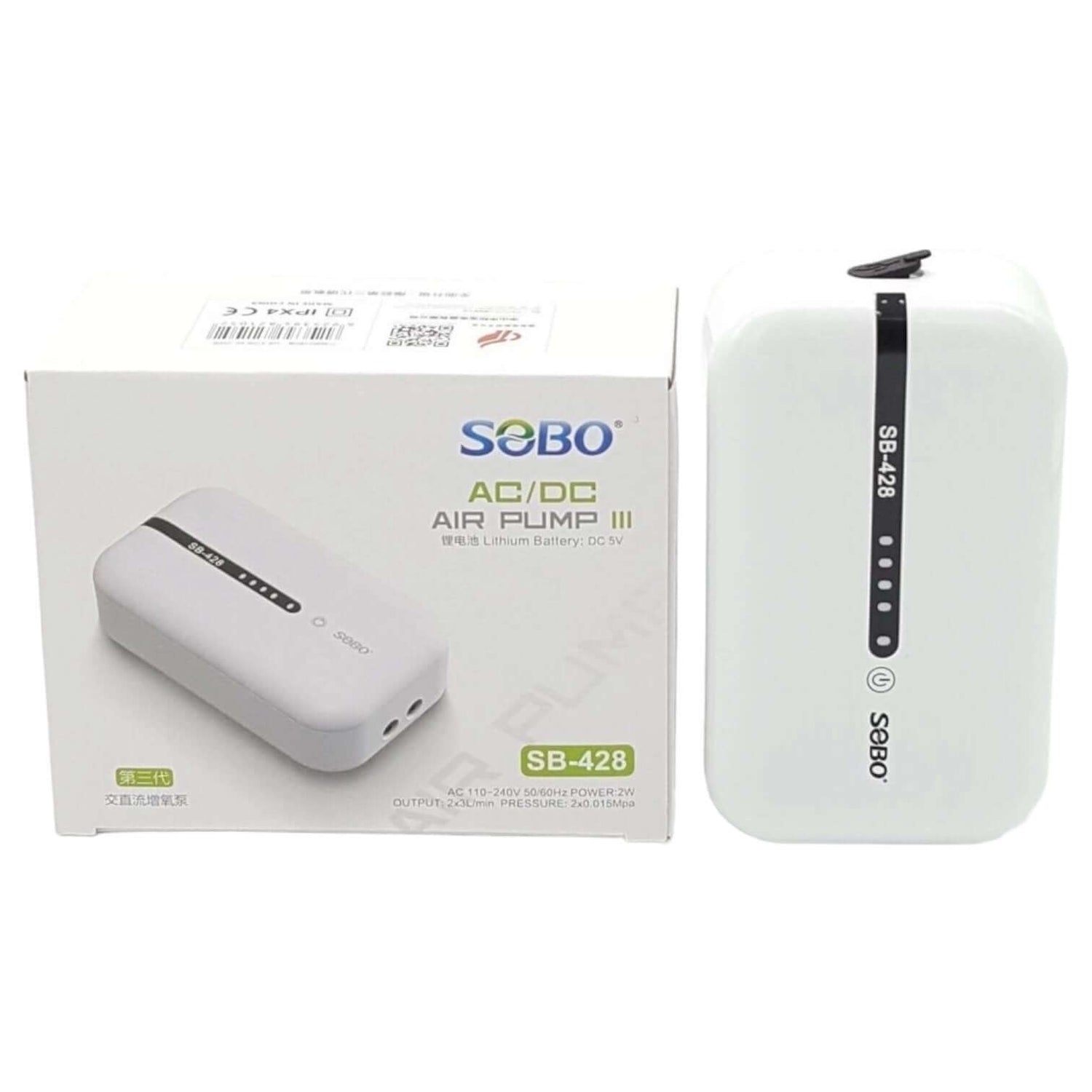 SOBO SB-428 AC/DC USB Chargeable Double Outlet Backup Air Pump is designed to provide air supply with a power output of 2x3 liters per minute and operates for about 24 hours after being charged via USB.