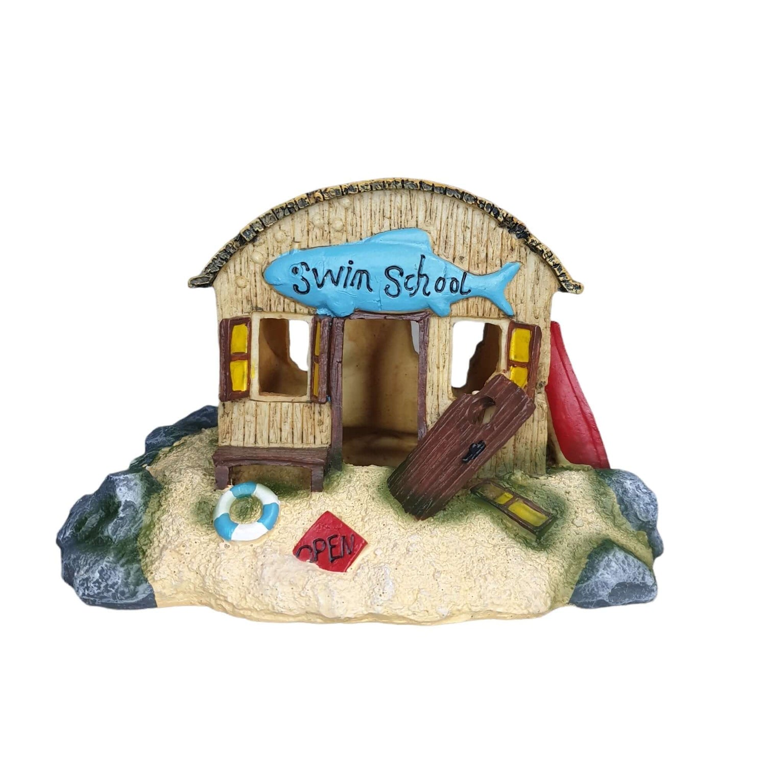 Swim School Shack Aquarium Ornament is used to enhance the aesthetic appeal of aquariums while providing a playful hideout for aquatic pets.