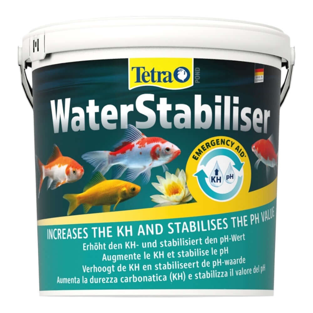Tetra Pond WaterStabiliser quickly increases carbonate hardness (KH) in pond water to prevent excessive soft water. This effect also stabilises the crucial pH value to prevent potential fish losses through a sudden drop of acidity. The KH level can particularly drop after prolonged spells of rainfall or due to natural decomposition processes. The decomposition of nitrogenous residue such as fish waste, leaves and other organic waste – known as nitrification – releases acids that continuously reduce the carbonate hardness of the pond water. This can quickly put the fish in danger: the lower the KH level, the more the pH value of the water will fluctuate. Tetra Pond WaterStabiliser prevents these problems. Stable KH and pH levels are a fundamental prerequisite for healthy water and the well-being of fish and other ornamental pond inhabitants. At the same time, stable water values are often a prerequisite for the use of other pond care products. Tetra Pond WaterStabiliser keeps KH and pH values stable when using KH reducing products like Tetra Pond AlgoRem to fight algae-growth and medicines like Tetra Pond MediFin. Before using Tetra Pond AlgoRem, you should make sure that the carbonate hardness of the water is at least 6° dH. Tetra Pond WaterStabiliser dissolves quickly and does not cloud the pond water. It is also safe and easy to use and cannot be overdosed. Check your water values regularly with the Tetra Pond Test 7in1. A KH value of 5-10°dH is recommended to stabilise the pH value. Tetra recommends to dispense half a bucket of Tetra Pond WaterStabiliser per 5,000 L of pond water on a monthly basis to increase KH by about 4 °dH. If required re-dose. e.g. after heavy rainfalls or prior to application of biocides, medications or products like Tetra Pond CrystalWater.