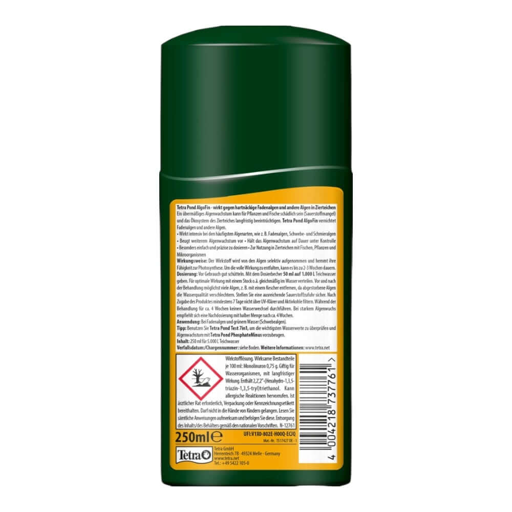 Tetra Pond AlgoFin effectively combats the most prevalent algae types, such as blanketweed, floating and slime algae in ornamental ponds. The special active ingredient will be selectively absorbed by algae and inhibits their ability to do photosynthesis. This way the algae are destroyed in a period of two to three weeks. Tetra Pond AlgoFin prevents further algae growth at the same time. This product is suitable for ornamental ponds with fish, plants and microorganisms. To achieve the best possible result shake Tetra Pond AlgoFin well before use and follow the detailed instructions.