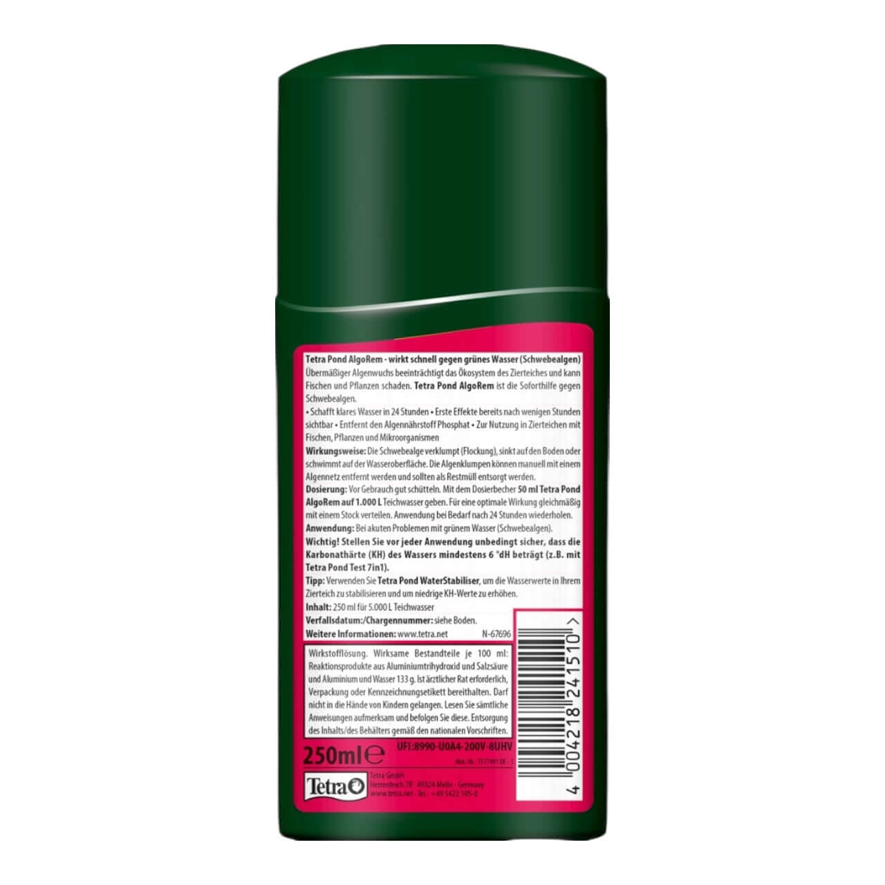 Tetra Pond AlgoRem eliminates green water in ornamental ponds within 24 hours to ensure clear water in the shortest possible time. The formula of this product causes the floating algae to form clumps. As a result they sink to the bottom or float up to the surface, where they can be manually removed, e.g. with the Tetra Algae Net, or extracted by the filter. The algae should be disposed as residual waste. Additionally, Tetra Pond AlgoRem prevents further growth of floating algae by removing the algal nutrient phosphate from the pond water.