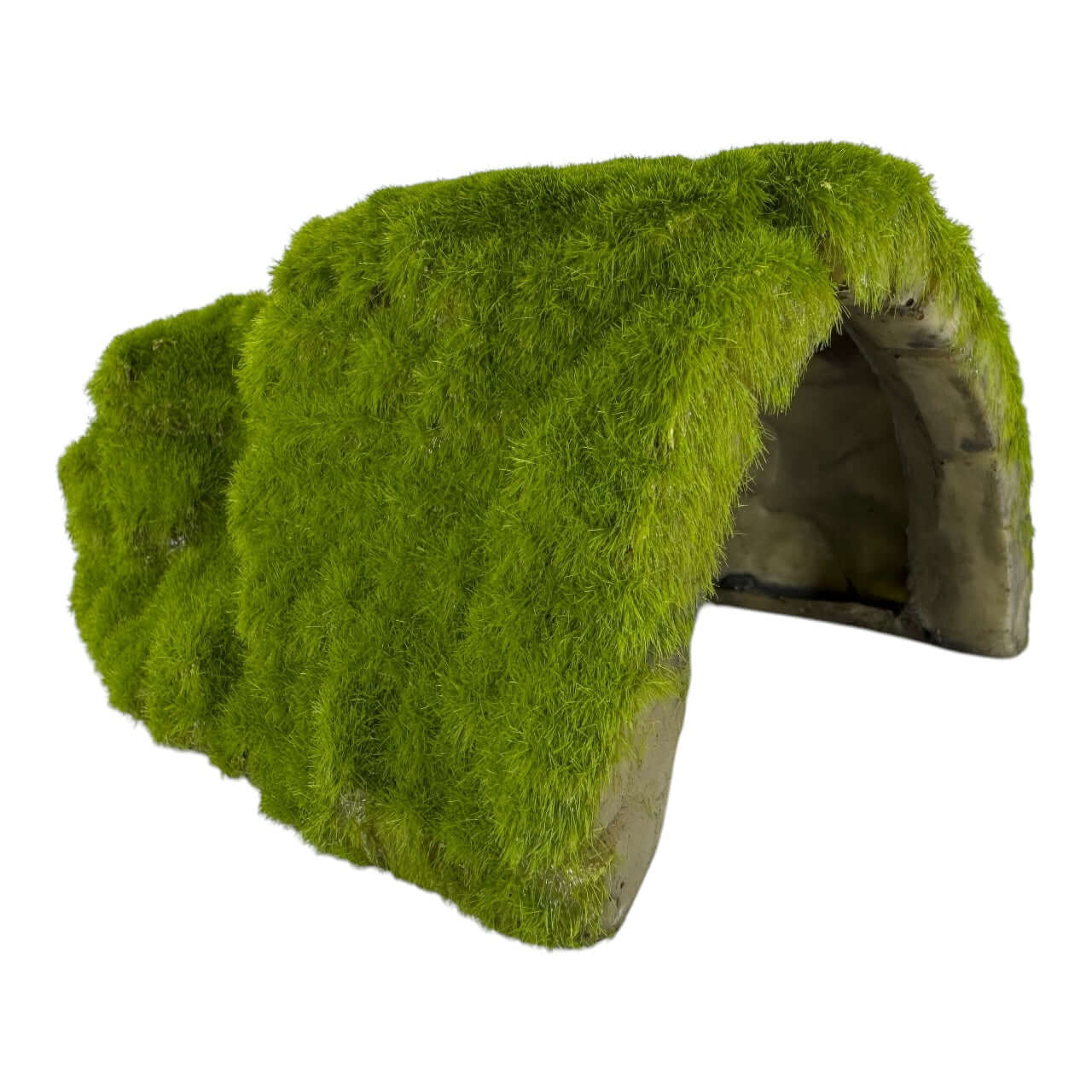 Tunnel with Moss Aquarium Ornament is used to enhance aquariums, terrariums, and miniature landscapes by providing a naturalistic decorative piece that serves as a cozy hideaway for fish, reptiles, and amphibians.