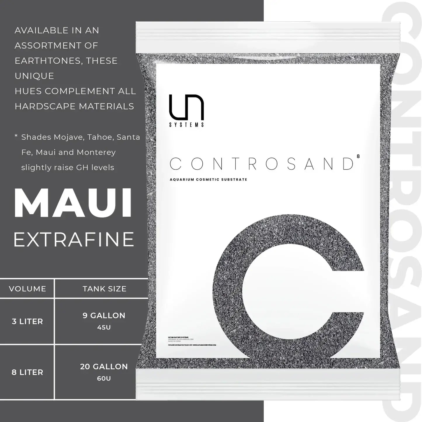Ultum Nature Systems Controsand is a line of decorative sand substrates designed for use in planted aquariums and aquascaping. Maui Controsand is a fine-grain natural sand. Its cool-toned palette works well when paired with natural stone and provides subtle contrast.
