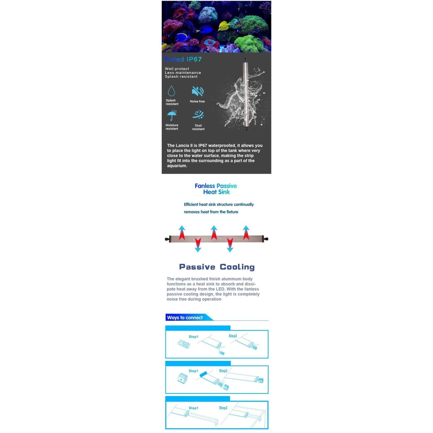 - Broad LED colour spectrum for greatest coral growth