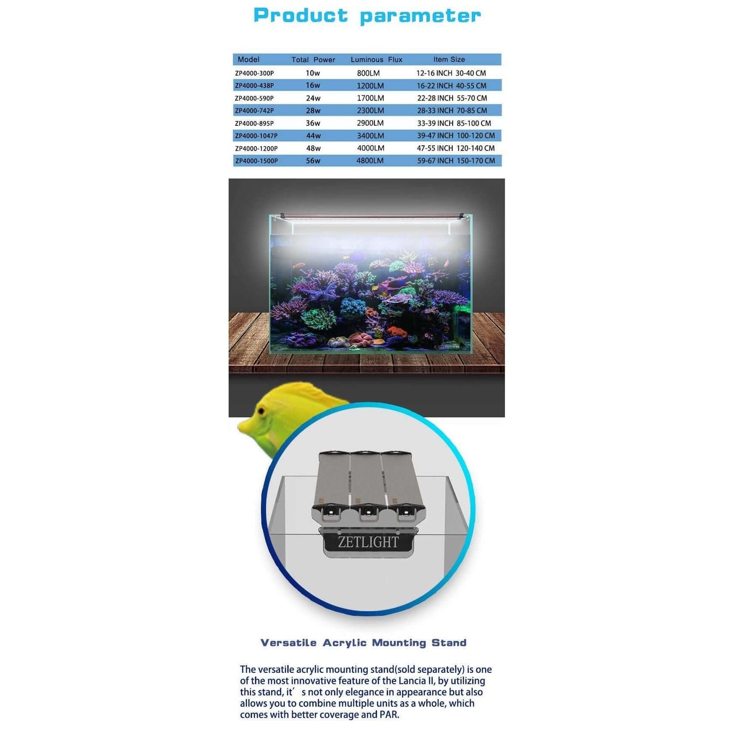 - Can be combined with the Zetlight Acrylic Mounting bracket for better light coverage